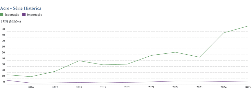 O Acre fechou o ano de 2025 com um saldo de exportações de US$ 98,9 milhões, um patamar nunca antes alcançado, representando crescimento de 13% em relação ao ano anterior. Dados do Ministério do Desenvolvimento, Indústria, Comércio e Serviços apontam que a balança comercial terminou 2025 com um superávit de US$ 93,7 milhões.
